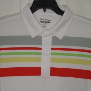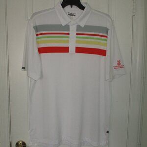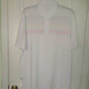 Straight Down Mens S/S "Ritz-Carlton Laguna Niguel" (CA) Golf Stretch Polo Shirt. Size XL. Armpit-to-armpit 24", Length 33.5". 95/5% Polyester/Spandex in White w/ Rainbow Chest Stripe. New w/o Tags, suitable for gifting.