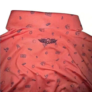 STRAIGHT DOWN Golf Polo - Orange Patterned, Size Large. This high-quality polo is made from a premium blend of spandex and polyester for ultimate comfort and breathability, perfect for the golf course or any casual outing. Embroidered on the left sleeve with the World Tour Golf Links logo, it adds a unique and stylish touch. In excellent condition with no stains, rips, or snags—just a tad wrinkled. A quick steam or toss in the dryer, and it’s ready to go! Stay sharp and comfortable all day long.