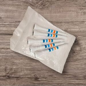 Set of white wooden golf tees from the brand, Straight Down, in sealed plastic bag featuring green, blue, and orange stripes. Perfect for golf enthusiasts.