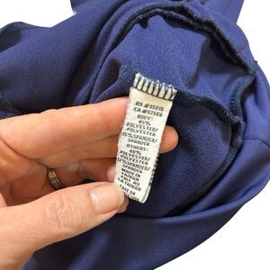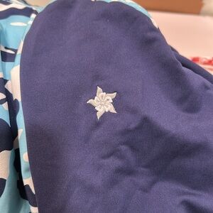 This shirt has a few small holes near the waist line as seen in last 2 pics. There is a small flower logo embroidered on one sleeve. Otherwise no flaws.