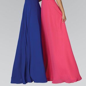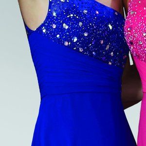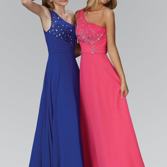 Long Formal Evening Dresses with straight neckline, one shoulder dress, open back with zippered closure, a-line shape.