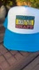 Stylish trucker hat featuring a vibrant patch. Blue mesh with a white front panel. Perfect for casual wear.