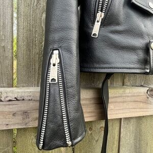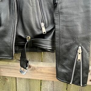 Authentic Straight To Hell black leather moto jacket in size Large. Crafted from supple genuine leather with a quilted lining for comfort. Features silver hardware, multiple zippered pockets, belted waist, and zippered sleeves. Classic biker style with a modern edge — built to last and gets better with wear.