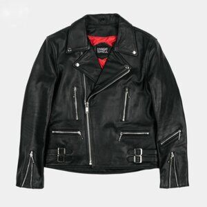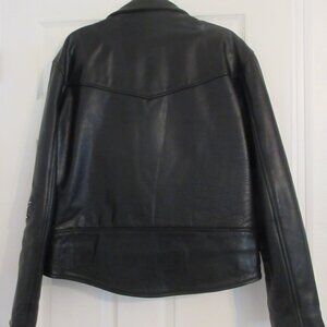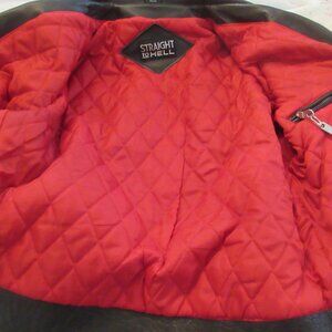Straight To Hell Defector Black Leather Jacket.Size 48.Perfect condition,only minor flaw is a small ball pull is missing from 1 pocket.Inside bottle opener intact.All pockets open and close with ease.Lining is clean.I honestly don't remember this ever being worn.Smoke and pet free.