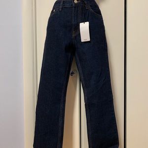 Denim style cotton fabric. Dark wash. Straight fit. High waist. Contrasting seams. Five pockets. Loops. Button up.