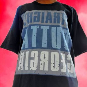 T-shirt with black background and says, "Straight out of Georgia" in bold and blue letters.