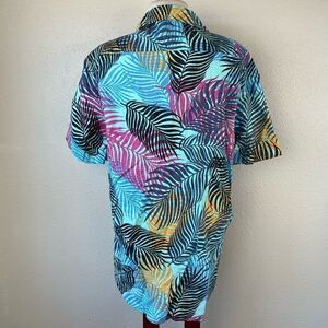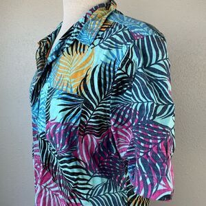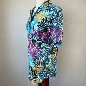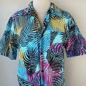 Super fun Hawaiian style shirt measuring 21 inches across the chest and 29 inches in length from shoulder to hem.