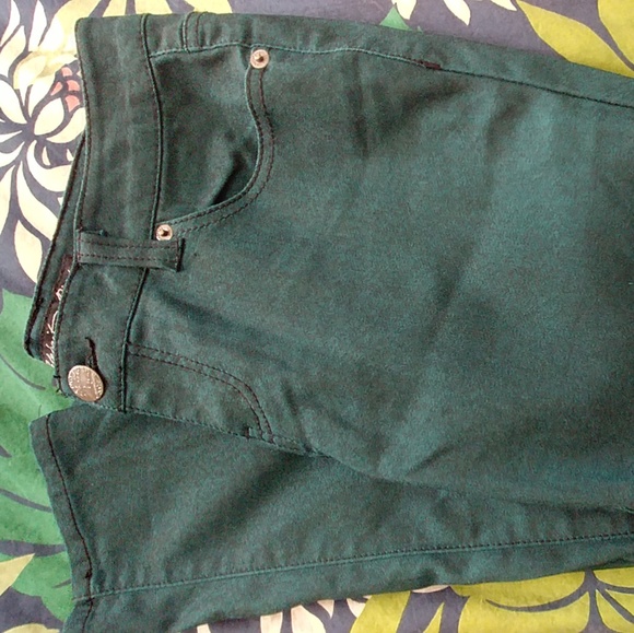 Low rise waist, teal with black threading, has a slight metallic look, stretch but NOT LEGGINGS