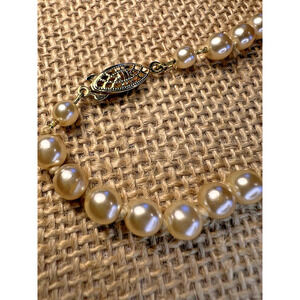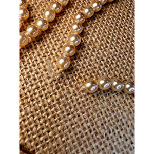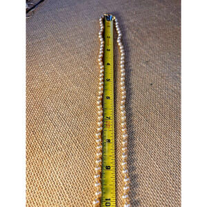 These faux pearls are beautiful with a pretty gold tone fishhook clasp. Approx 28 inches total length. Can be repaired or remove and use pearls in another application.