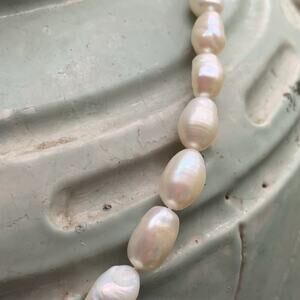 This product is a stunning strand of freshwater ringed pearls with gold tone findings, measuring 17 inches in length. The pearls are natural, cream-colored, and elongated irregular oval in shape. The necklace is perfect for various occasions such as engagements, weddings, anniversaries, and birthdays. With a vintage style and beaded design, this unique piece of fine jewelry is a statement accessory for women looking to add a touch of elegance to their outfit. The gold tone push closure with safety feature ensures secure wear. No markings and gold findings did not test real gold.
