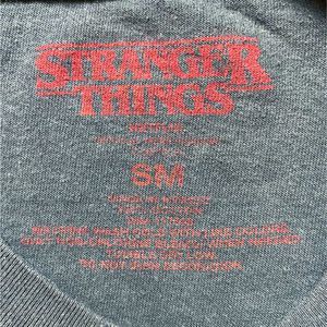 Dark gray crew neck short sleeve tee, white Stranger Things graphic and lettering on front