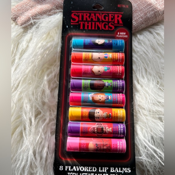 Set of 8 Stranger Things flavored lip balms. Vibrant colors and fun character designs.