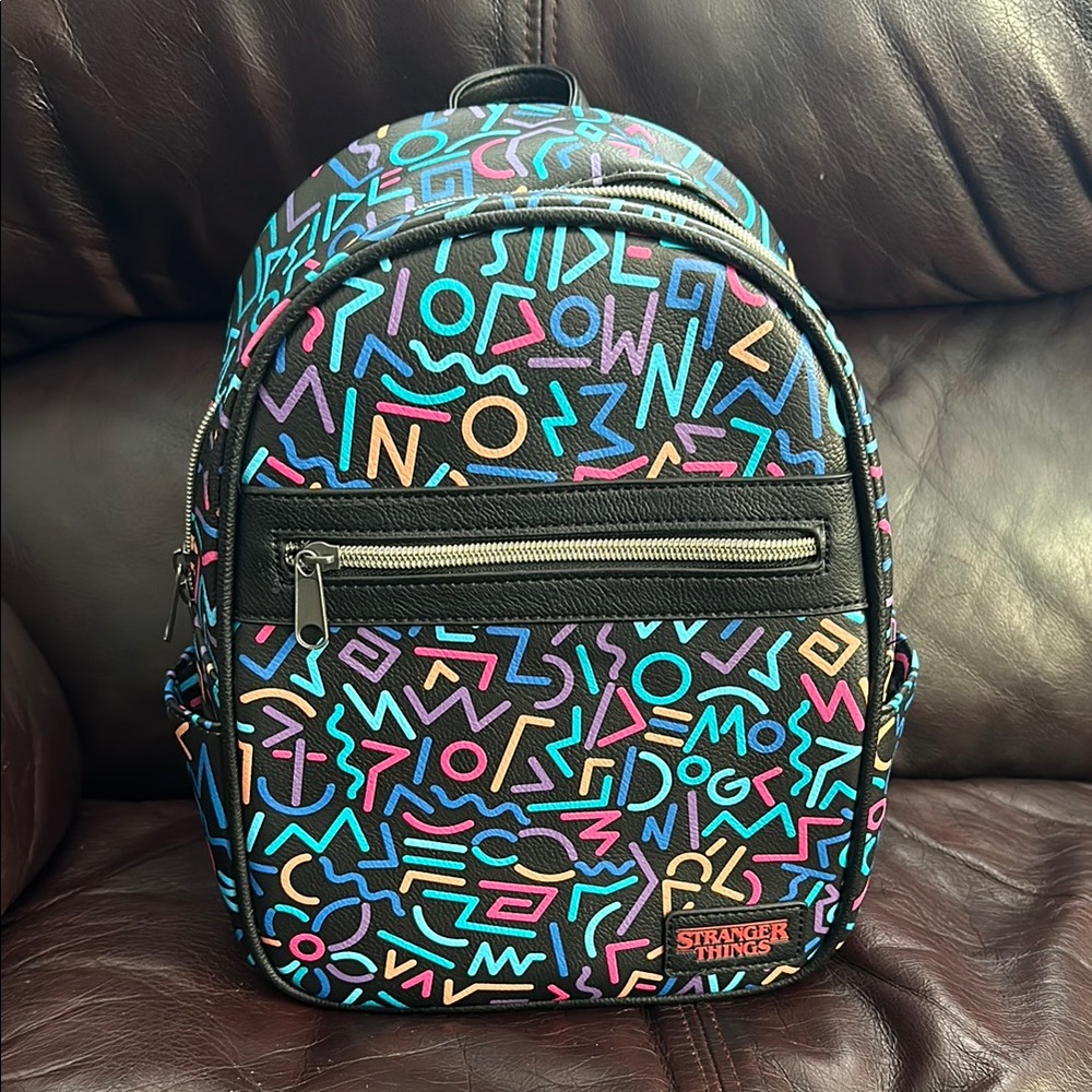 Vibrant backpack with a geometric pattern. Features a mix of colors including blue, pink, and orange. Perfect for any Stranger Things fan. NWT