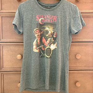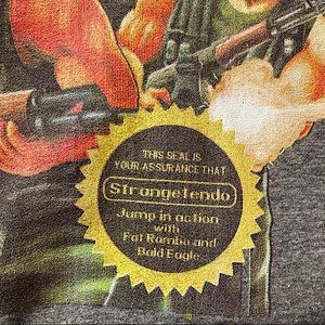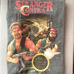 Graphic, tri-blend/extra soft tee from TeeRepublic in heather gray w/Stranger Contra artwork starring Fat Rambo and Bald Eagle (from Stranger Things Season 3). Is a women’s cut in size large, but it runs small. I am normally a size small, & the tee is somewhat form-fitting (see photos of shirt on me above). NWOT & from a smoke-free home. Offers welcome! :)