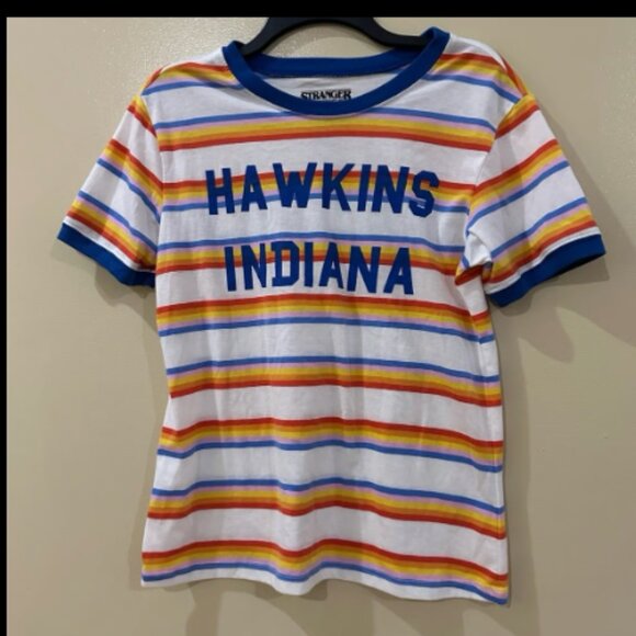 This Stranger Things t-shirt features the text "Hawkins Indiana" on a bright multi-color stripe tee with a blue ringer neck and sleeve. This tv series follows the story of the investigation of a young boy's disappearance and the supernatural events that surround the mystery. Made from 60% Cotton 40% Polyester and tagless for added comfort, this shirt is sure to be one of your favorites.