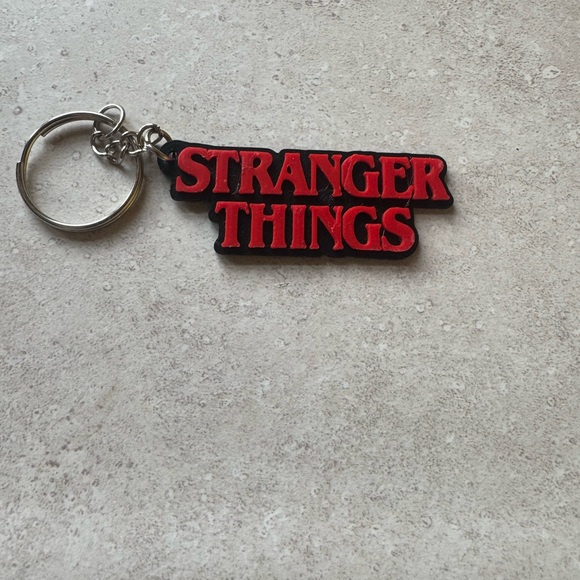 Stranger Things keychain with bold red lettering. Perfect for fans.