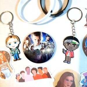 Stranger Things Max an Lucas Fan gift set 2 Keyrings Pins Bracelets and Stickers