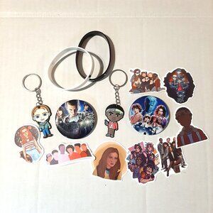 Includes two Max and Lucas 3D character rubber key ring baubles, 2 Plastic pin with graphics, 2 Rubber Bracelets with graphics and multi show related stickers. Great for a fun little gift for a Stranger Things fans birthday or stocking stuffer.
