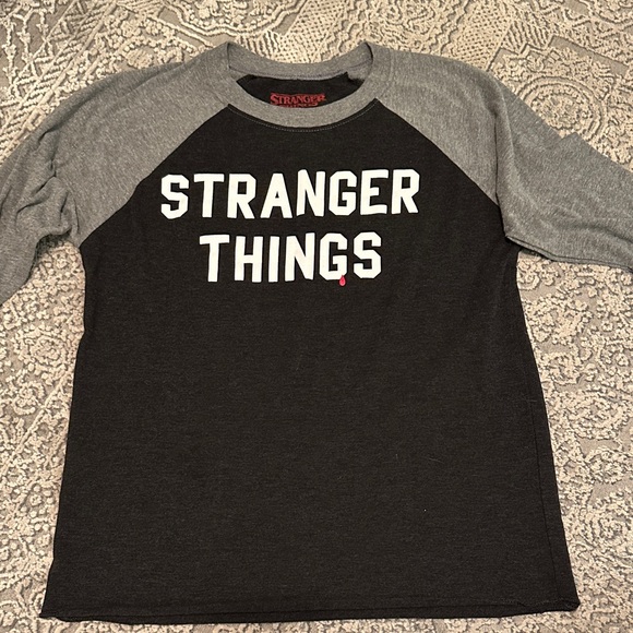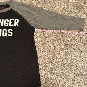 Black and gray raglan t-shirt with 'Stranger Things' print.Super soft material. Raglan sleeve length could be considered top of wrist length, aka bracelet length, think baseball t sleeve style. Size Small (I’d assume women’s.)