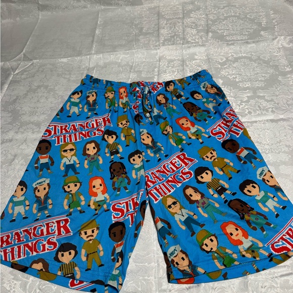 Vibrant blue shorts featuring fun Stranger Things character prints. Ideal for fans.