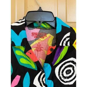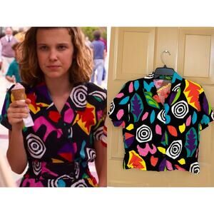 Step into the Stranger Things universe with this bold, vintage-inspired button-up shirt! While not the exact piece, this shirt perfectly channels Eleven’s Season 3 aesthetic, featuring an 80s Memphis-style abstract print similar to her iconic Starcourt Mall outfit. Whether you’re a fan of the show or just love a bold, retro statement piece, this shirt is a must-have!