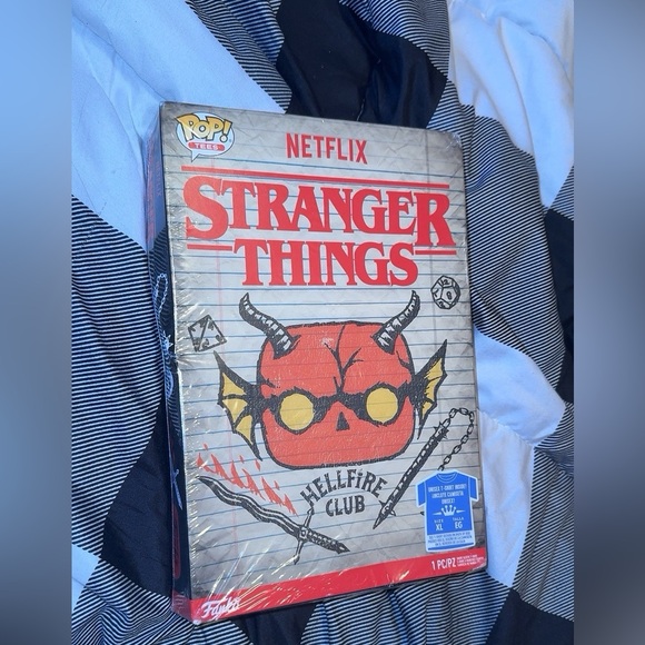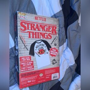 Funko shirt featuring Stranger Things Hellfire Club design. Bold red and black colors. Great for series enthusiasts. RARE brand new sealed!