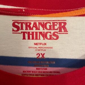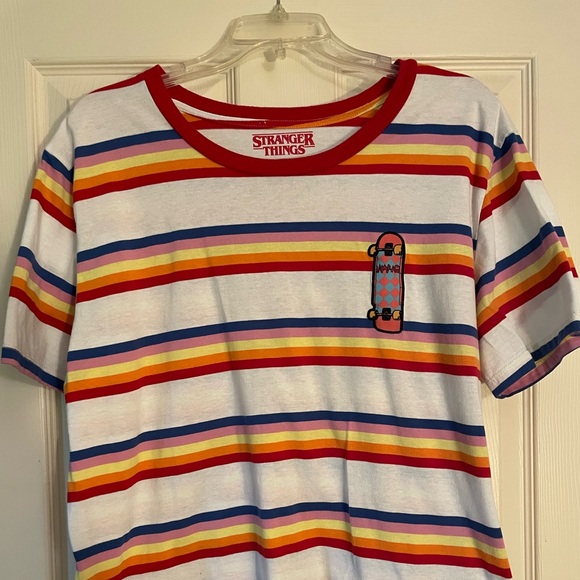 Stranger Things tee shirt with skateboard embroidered on front. 22 inches long