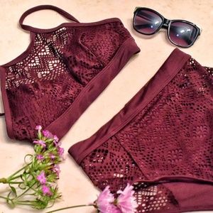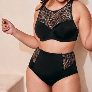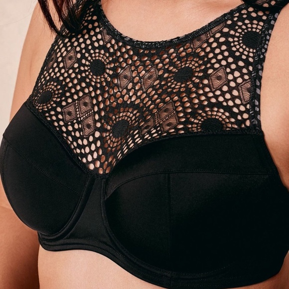 2in1 Contour Plus High-neck with halter crochet Connected front in 42D Swim or Crop top Strappy Nylon Black Crop Top Bra Swim Bikini Dance Top Strap Merged wide stripe mesh front some cleavage show High Neck Black Swim Top Crop Top Bikini Bra