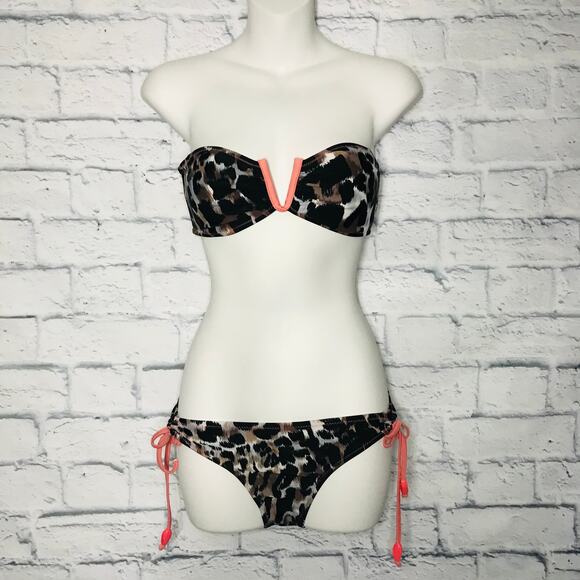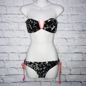 Preloved Comes w/ bra padding, back tie, size unknown, animal print style. Bottom has side ties, size unknown, washed-still has stain in crotch area that did not come out.
