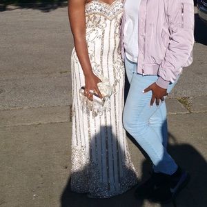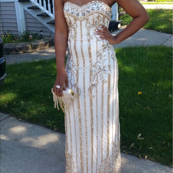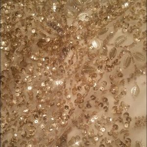 The bottom of the dress was hemmed up by sewing it so you can easily cut it and take the thread out. Some beads were lost at the bottom but you can't tell at all because there were so many. This dress fits at the top and at the waist and is pretty loose at the bottom. If you look up the dress the pictures are kinda ugly I promise you it's not bad when you try it on yourself.