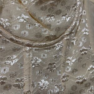 Longline bustier in a soft ivory/champagne shade. Structured underwire cups (lightly padded). Floral lace. Feminine