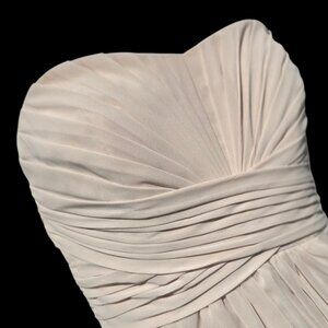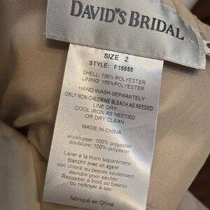 This beautiful bridesmaid dress by DAVID'S BRIDAL will be perfect for your formal occasion. This chiffon dress features a sweetheart neckline with ruched detailing. The color is a light champagne. 100% polyester. Fully lined. Back zIp. The color is a light champagne. Style F15555. Very good pre-owned condition.