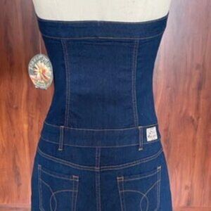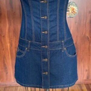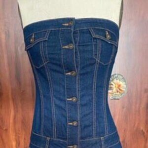 A playful, junior-ready strapless denim mini with a flirty, casual vibe. Fitted, strapless bodice, this dress creates a clean, flattering silhouette that shows off a youthful edge. Functional front buttons and real pockets add that perfect mix of style and utility — two in the front, two in the back, keeping the look balanced and authentically denim.