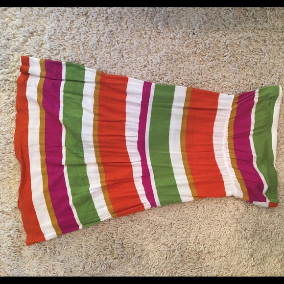 Picture is sideways - sorry. Striped sundress. I'm 5'8 and it comes to my mid-thigh maybe a little shorter. Doesn't have a size with tags. I'd say it fits a small or smaller medium.