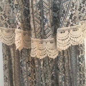Muted color boho maxi. Strapless with flowy overlay on chest. Crochet detail on overlay. EUC...worn handful of times.