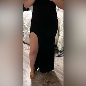 Never worn formal dress (only worn to try on/take pictures) strapless with a v-neck slit, and slit on the leg. Zipper on the back and mid arm strips.