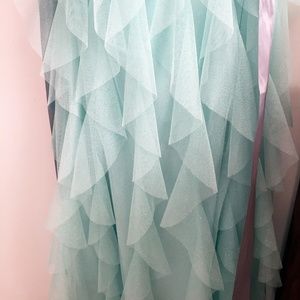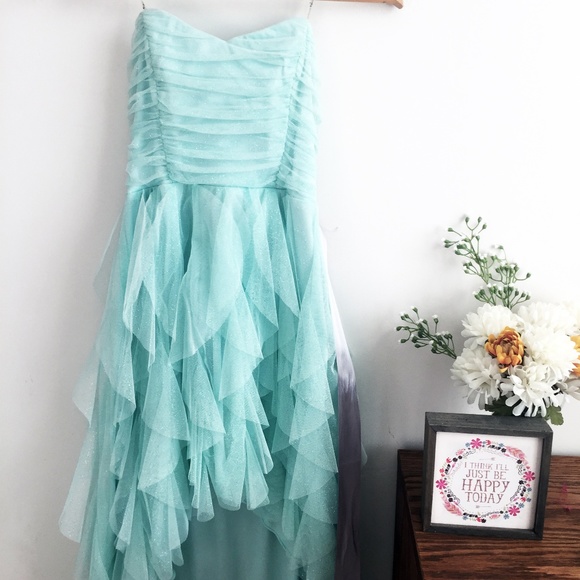 This adorable strapless formal dress is high-low style and would be flattering on any shape. The dress is a light turquoise color and features ruffles past the waist and glitter/sparkles all over. This would make an excellent prom dress (as seen in the photo). Only worn once and ready for a new home!