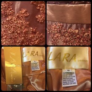 💥💥💥Lara Design Exquisite Lara dress features a strapless ruched accented bodice with banded waistband. Exquisite Lace applique surrounds the skirt, which beautifies the dress. Whenever you wear it, there is no doubt that you are the spotlight for the night in this beautiful dress! Fully Lined. Bust slightly molded and boned. Concealed side zipper. Comes with detachable spaghetti straps & extra beads in repair bag. Length is 33"💥💥💥