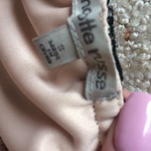 It is a beige dress with black lace, and it zippers up. It is strapless. Never worn before but tags have been removed