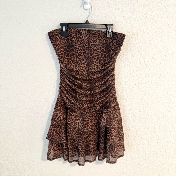 Flirty strapless mini dress with all-over leopard print. Ruched bodice and tiered ruffle skirt. Lightweight, flowy fabric perfect for a night out. NWT Never Worn. Size Large. Stretchy. Bought for $26.99
