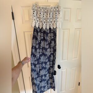 Blue floral. Tie waist. Super flattering. Lace covers the bust area. Great condition. Bought at a local boutique.