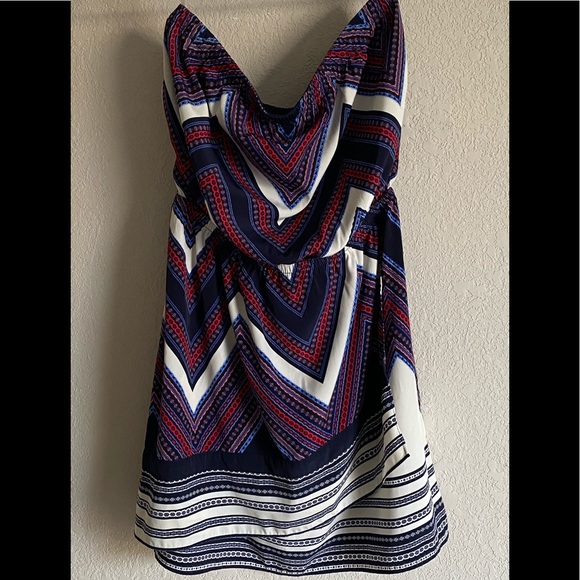 Strapless mini dress with a lovely flow and captivating colors. Perfect condition. Looks great on the beach!