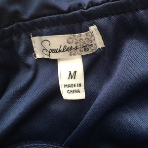 This dress is from Kohls and is sized a medium from the junior section. It's fitting yet a bit stretchy. I wear a size 2 in the women's section and this dress still fits me. You can pull the bottom up or down to make the dress a bit shorter or longer for that perfect look! Strapless and navy blue with a ruffle design to make your curves pop!