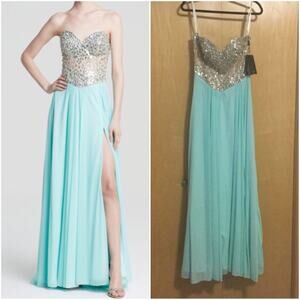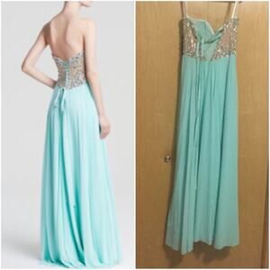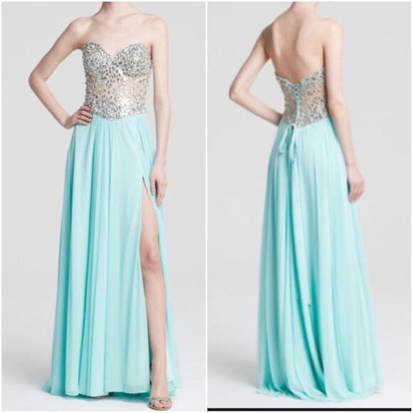 Women's Green Gown - Strapless Sweetheart Neck Embellished Bodice & Chiffon Skirt Radiant baubles and sequins lend a dazzling finish to this embellished, lace-up gown from Terani Couture. Sweetheart neckline, strapless, embellished ...