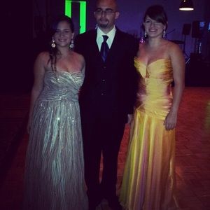 Beautiful gown only used once. Has Copper and silver sequins. Zips up at back. Suited for a woman that wears 4-6 sized dresses. Top chest has a rubber so it doesn’t slip down