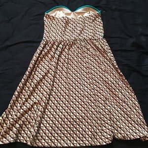Strapless dress with tan geometric pattern and turquoise piping. Gently used, only worn once.