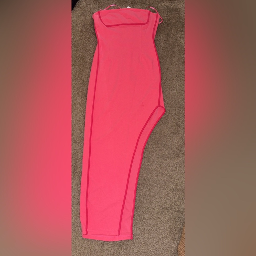 Elegant strapless dress in a vibrant pink hue. Perfect for any occasion.