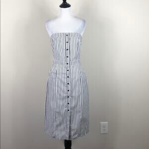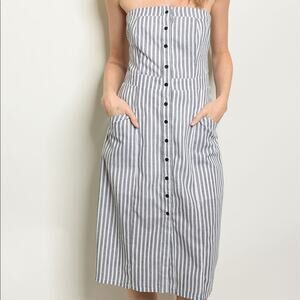 Strapless pinstripe midi dress. Elastic stretch across top of back. Rubber gripping across top to hold dress in place. Hook & eye closure at center front above top button. Front pockets. Lined. 70% cotton, 30% polyester.