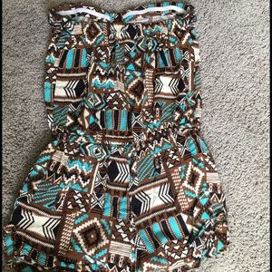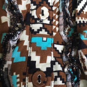 Only worn a few times, it ties around the waste and has buttons from the waste up. It is pixel patterned (brown, cream, blue and black) I cannot remember where I got it but the tag says "Fcny" It's a size medium and 100% Rayon 😊 Smoke free home!