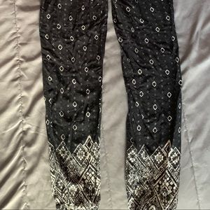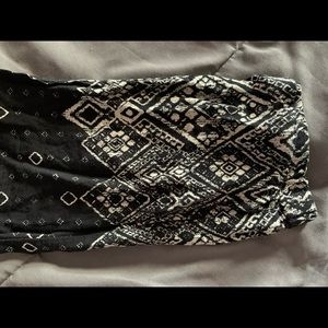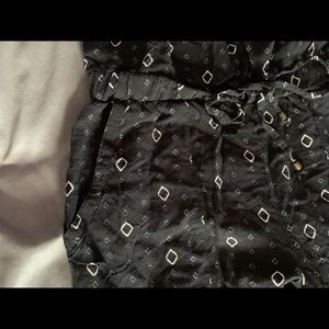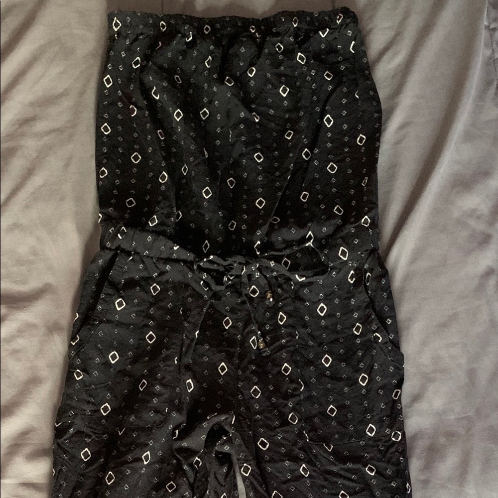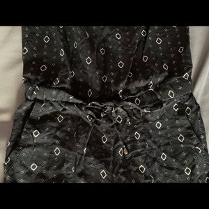 This strapless long romper is very comfortable and versatile. the black pattern takes up most of the romper then there’s another white pattern at the very bottom. It synched around the waist with a cute tie and it has pockets.
